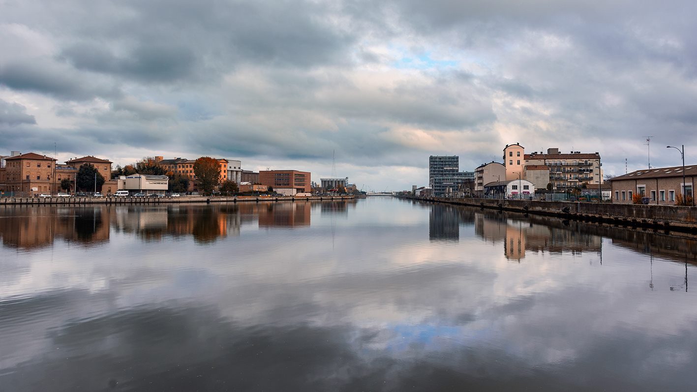 Cielo specchiato su acqua immobile, riflessi delle costruzioni ai lati.