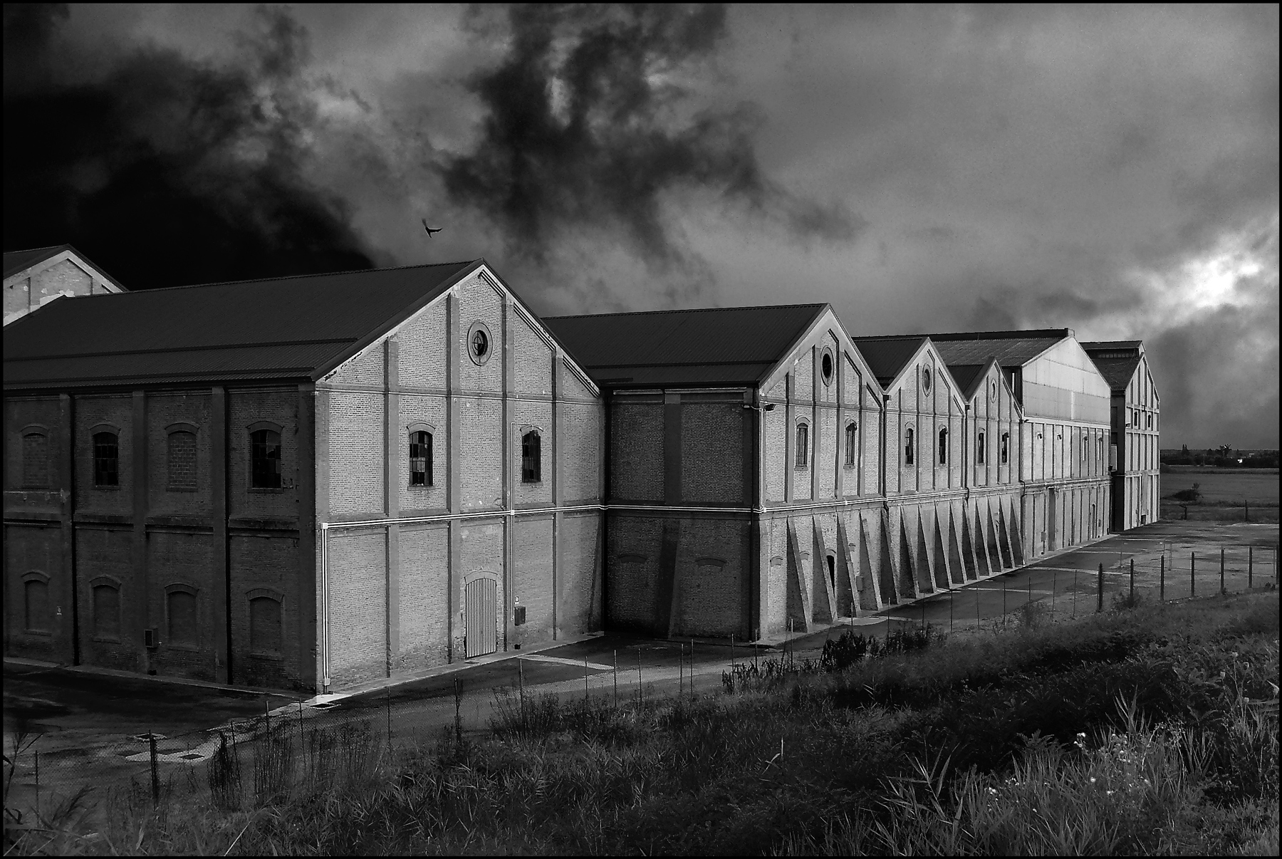 Tenebrosa ed austera schiera di fabbricati sotto un cielo drammatico da metter i brividi. Location di straniante e quasi angosciosa evocazione. Mi piace Ciao