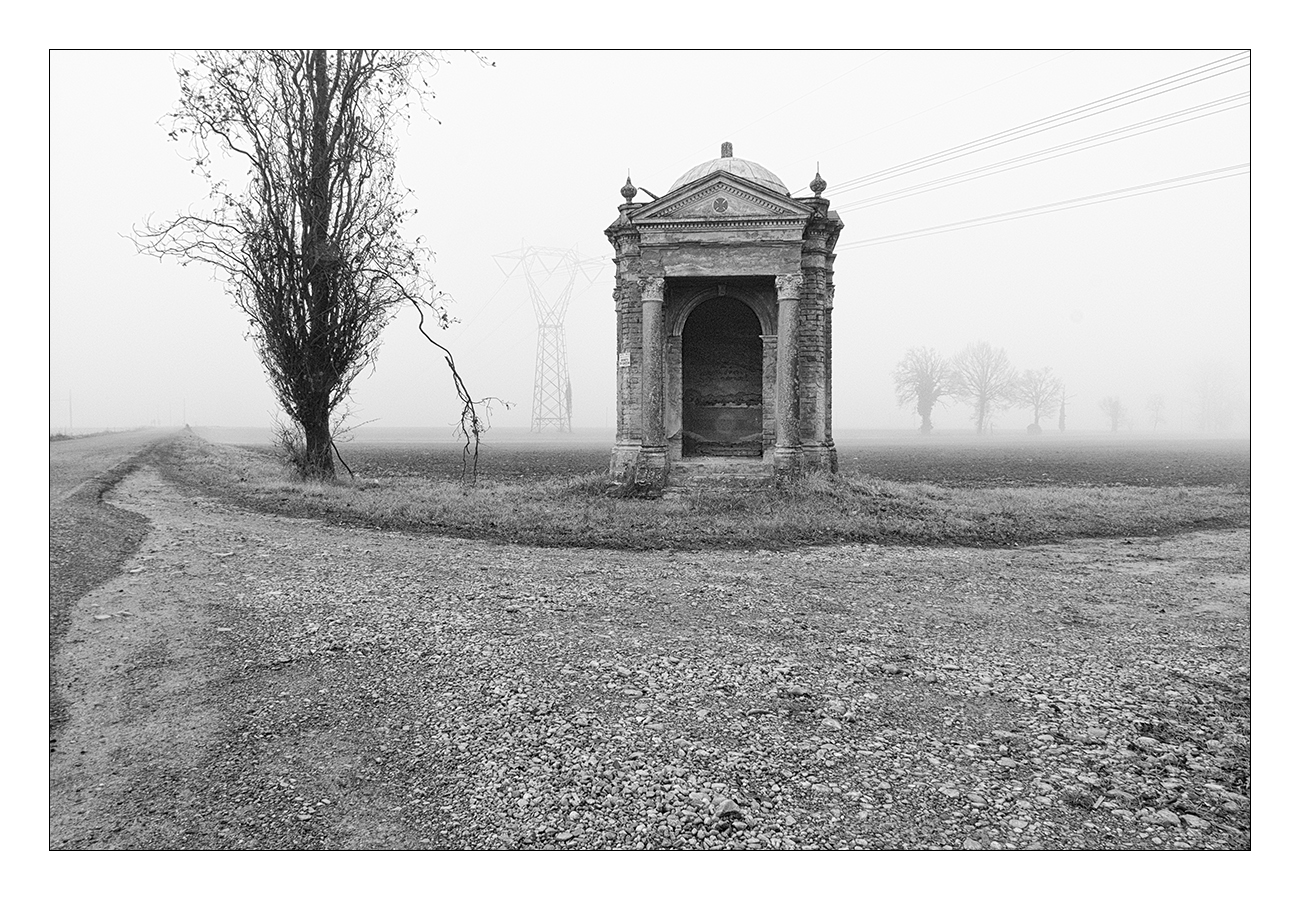 Amo le edicole e le piccole cappelle che si incontrano a volte in zone piuttosto isolate.Bellissima questa nel suo aspetto dimesso che ben si amalgama nel brullo e desolato paesaggio.Ottimo bn,taglio,come hai spiegato,vincolato alla focale con il conseguente taglio dell'albero per me non drammatico.Complimenti! Ciao,Sergio.  _________________ Sergio Demitri https://www.flickr.com/photos/124946035@N02/ |
