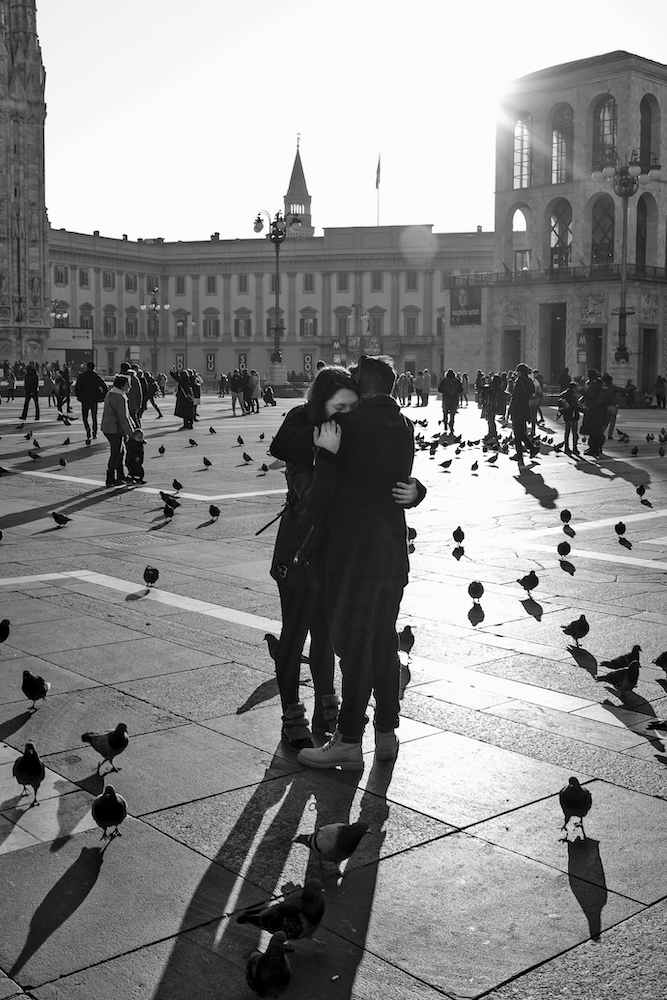 Bel controluce e bella ambientazione architettonica, umana e perfino ornitologica per questo abbraccio un po' disperato.