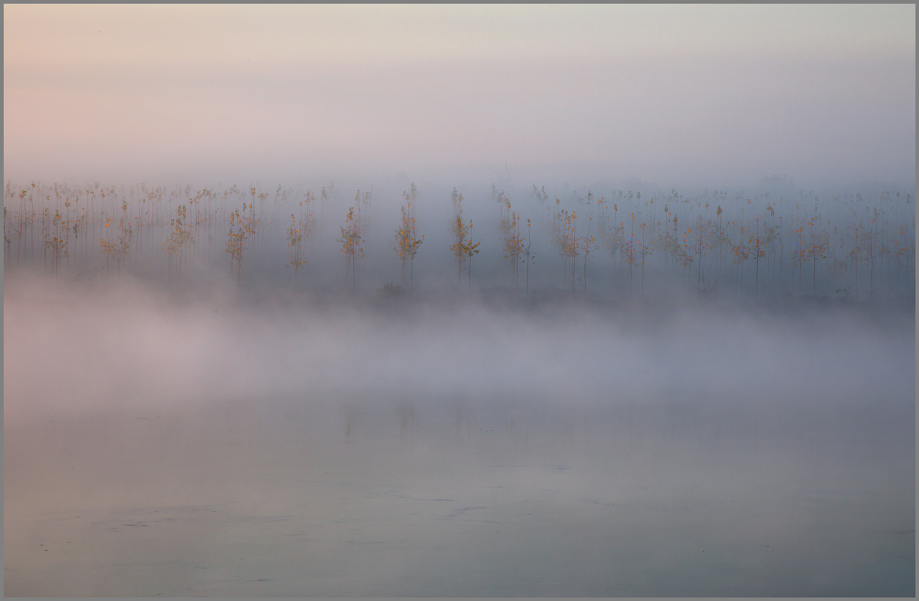 Ottimo scatto e composizione..di piccoli alberi avvolti dalla nebbia,e la dove il sole riesce ad illuminare,li rende di una piacevole colorazione dorata..mi piace molto e Preferita.Un caro saluto e buon fine di serata