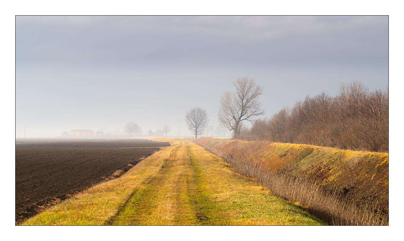 la nebbia si è appena alzata e ora i colori del prato e della terra risplendono vividi e conducono lo sguardo fino a un cielo pallido. Molto bella anche per me