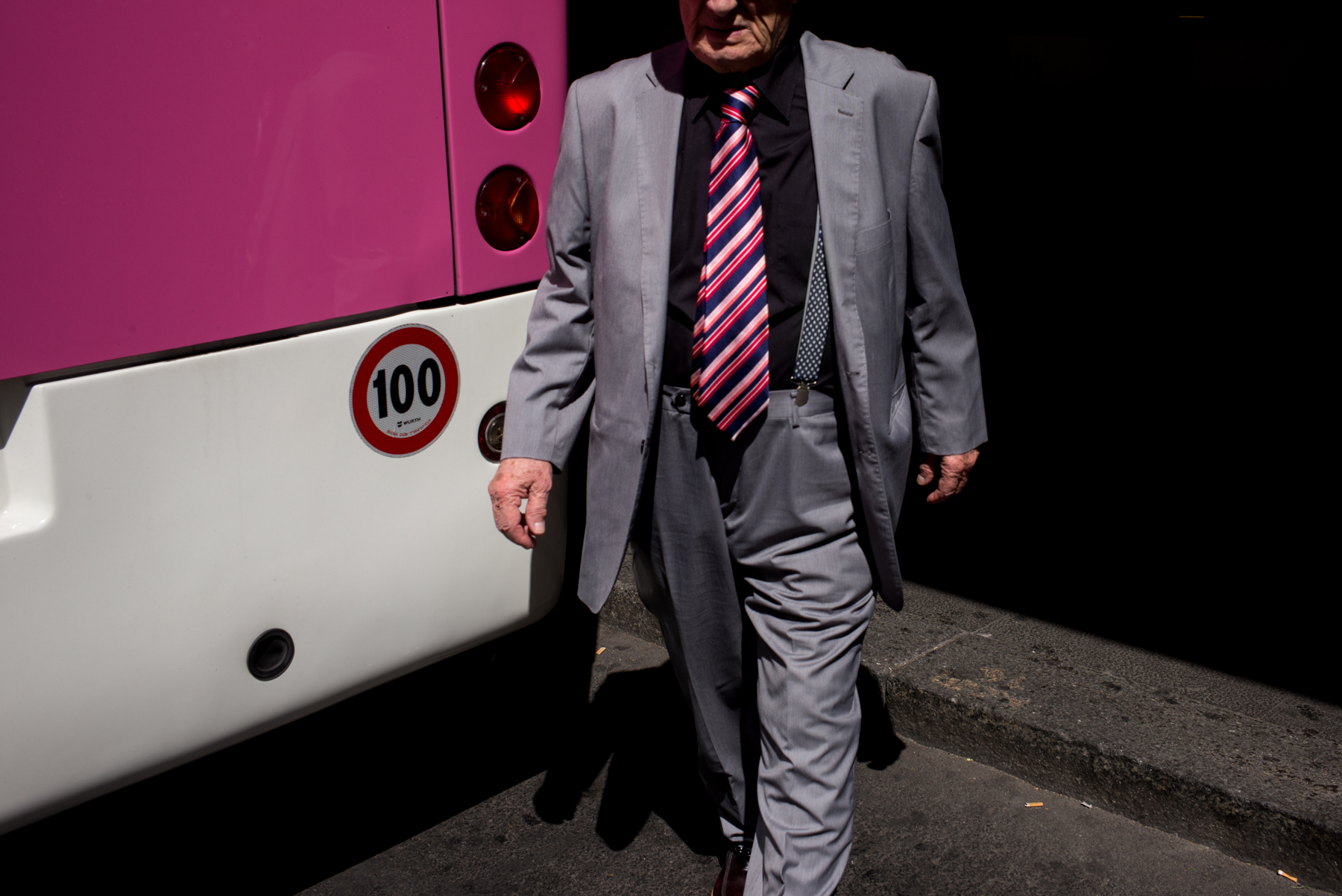Non ho tagliato all'altezza del nodo della cravatta, come avrei voluto in un primo tempo, perché mi andava a tagliare anche il fanale tondo dell'autobus, che invece per equilibrio compositivo, mi piaceva intero.