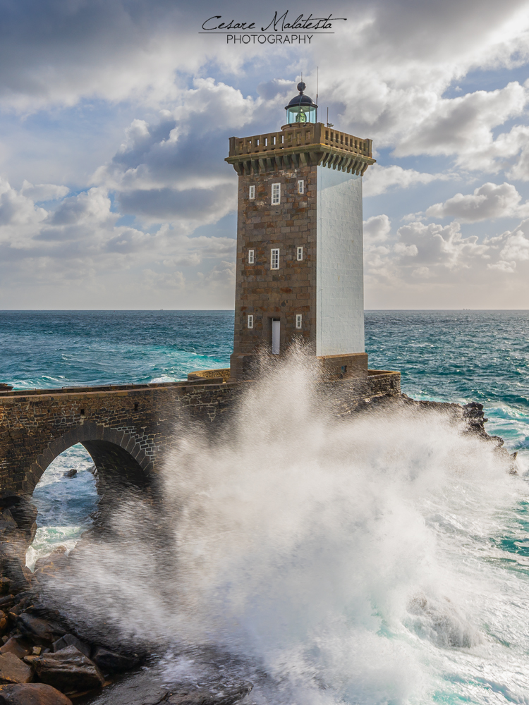 Perfetto il tempismo, l'onda prepotente si infrange sulla struttura, nell'eterna lotta dei fari contro le maree.