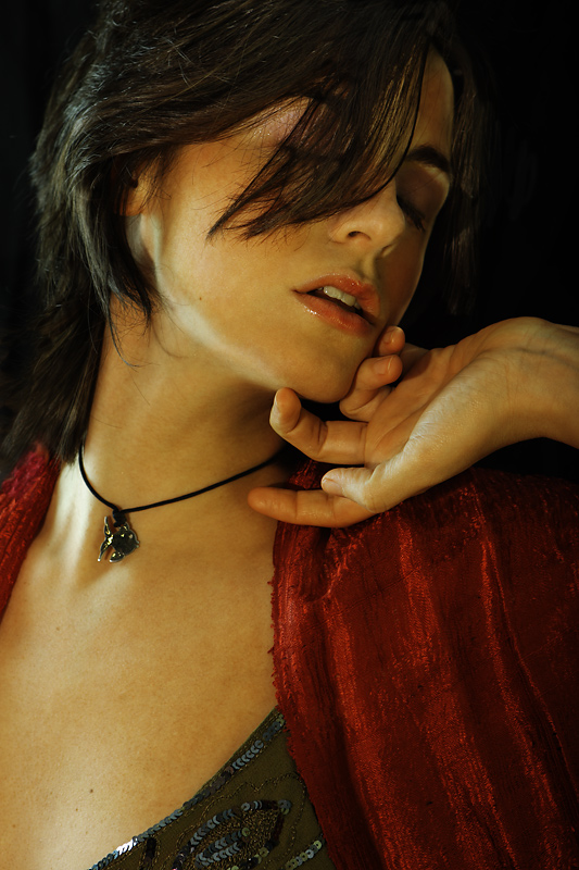 Mi convince tutto: taglio, composizione, posa, espressione molto sensuale della modella, mano e dominante colore. Trovo molto particolare e bello quello spruzzo di luce che cade a sinistra del gioiello, sul collo. L'alternativa potrebbe essere con tutto il braccio visibile, e il volto alla sinistra del fotogramma. In ogni caso mi piace così.