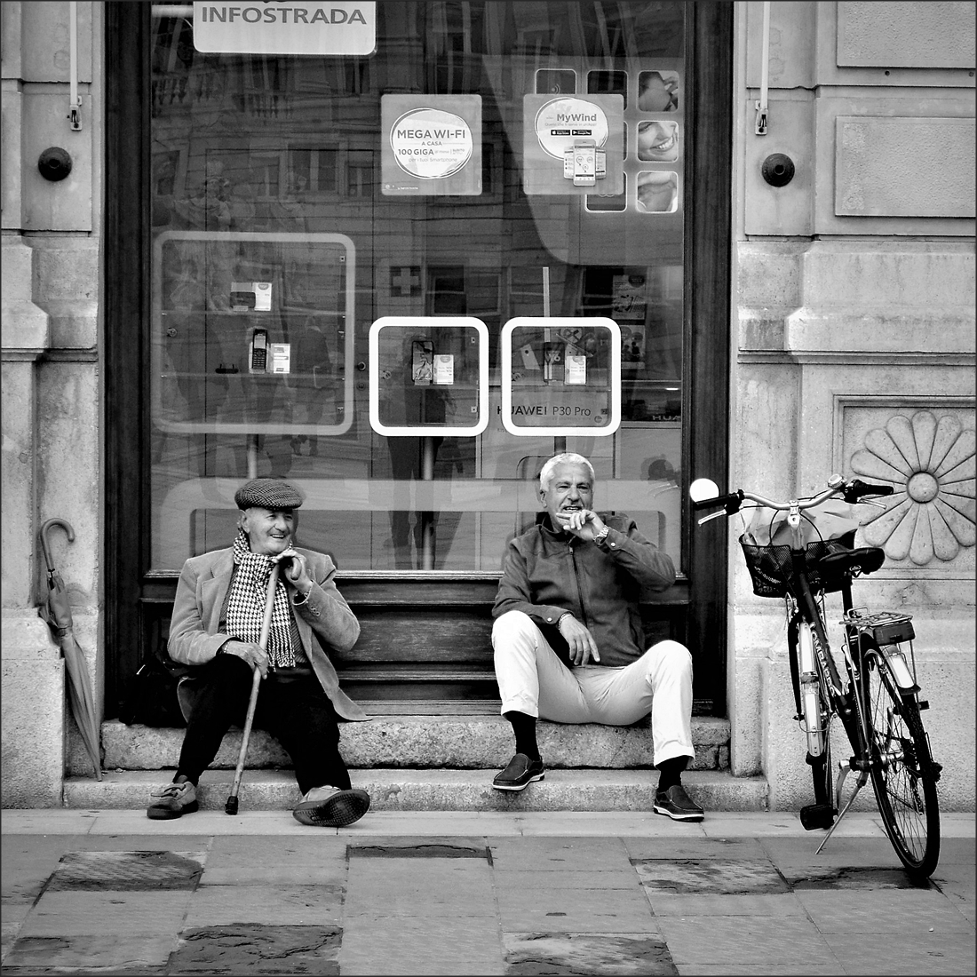Quando una foto racchiude in se un messaggio, un emozione. I sorrisi sereni delle due persone , probabilmente amici, che volgono la schiena alla moderna tecologia virtuale in vetrina Un contrasto fra socialità reale e virtuale dove vincente risulta il sorriso dei due diversamente giovani che sostano rilassati sullo scalino.