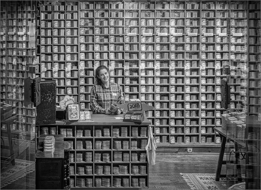 Una gran foto ,c'è tutto ,il motivo di fondo amplificato dal riflesso, il ritratto ambientato, le geometrie che rimbalzano e il delizioso richiamo della camicetta della signora che ti regala lo sguardo in macchina con un sorriso. Del bn niente sò dirti di tecnico ma mi piace perchè uniforma in un certo senso. E che dire della composizione? perfetta ... insomma ,una misticanza delle tue di grande effetto.