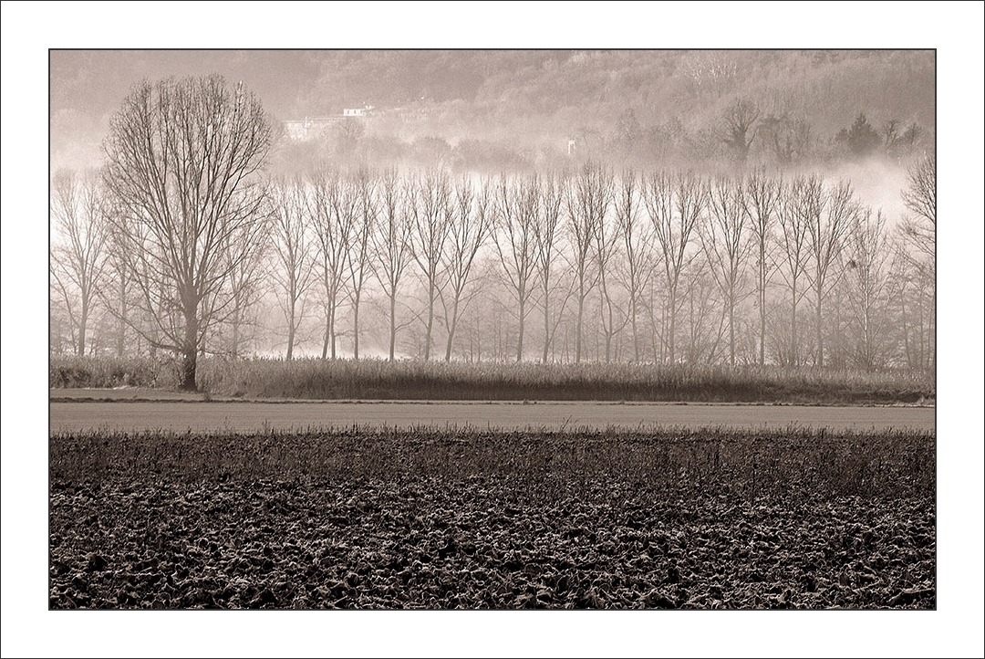 Bellissima atmosfera invernale. Leggera foschia che avvolge il paesaggio in un vedo non vedo suggestivo. Bella anche la composizione con il maestoso albero a sx che interrompe la frequenza lineare dei sottili alberi a fianco.