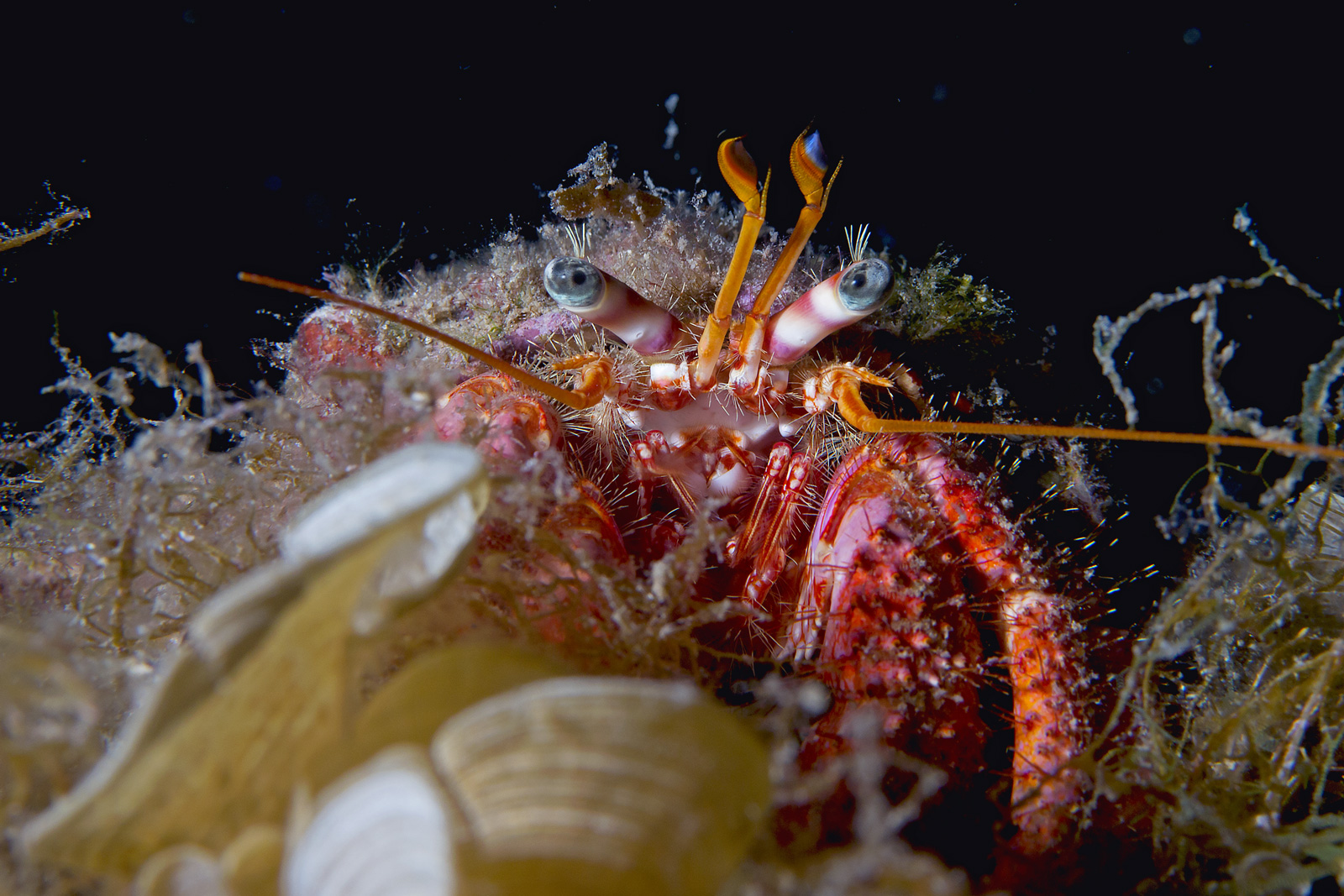 Un piccolo paguro sorpreso mentre vaga di notte.