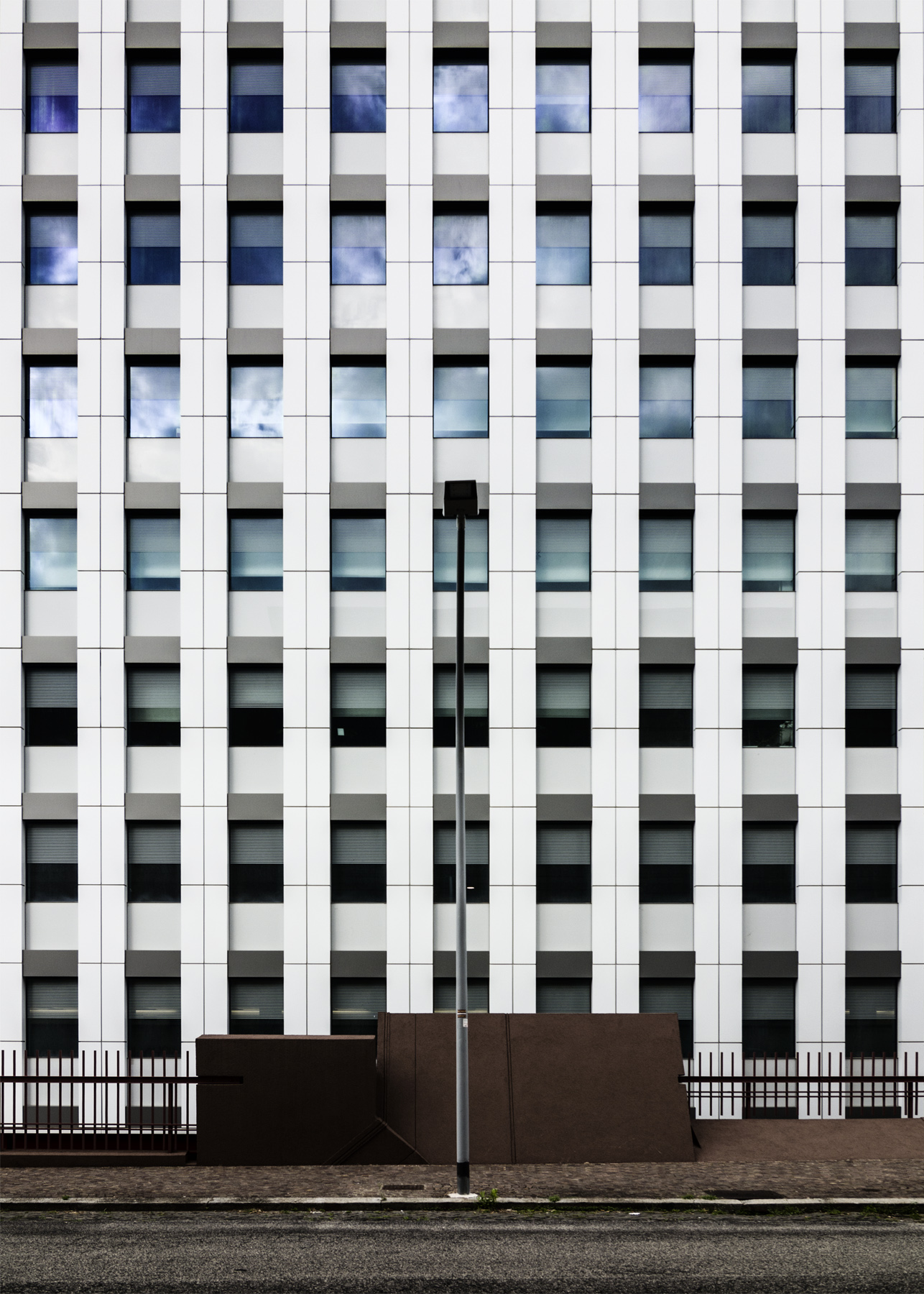 immagine composta con rigore e precisione, bello il riflesso del cielo nelle finestre, mi piace