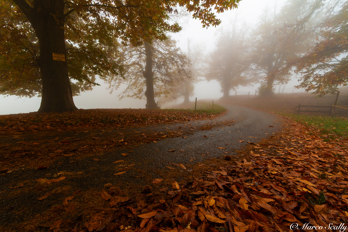 molto molto interessante, un fogliame a terra che affascina quanto la nebbia che accompagna la strada sullo sfondo.