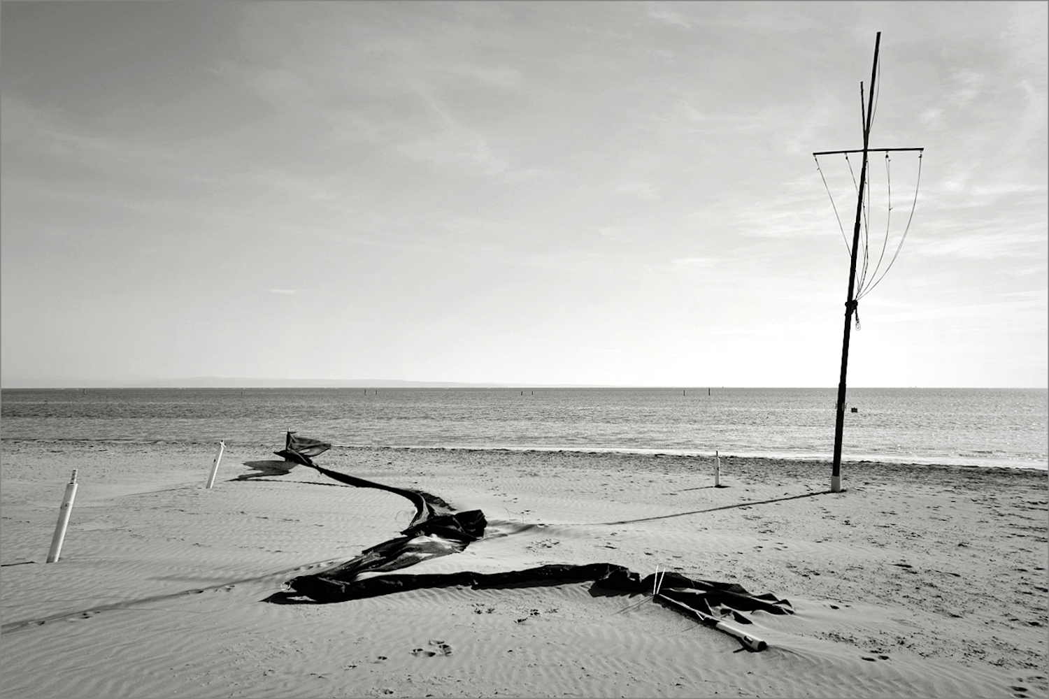 Vela di fili e anse di rete insabbiate, il vento che piega e disegna.