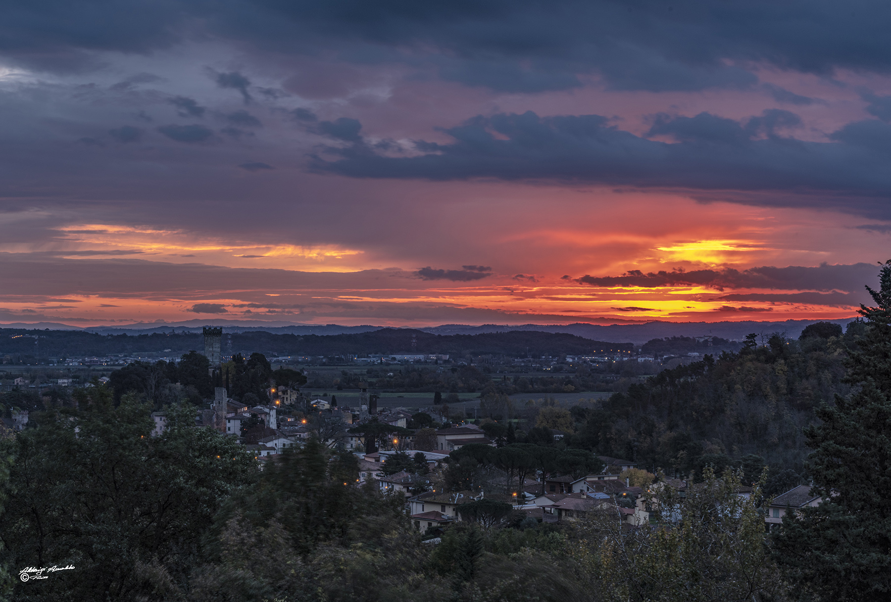 Bello il contrasto tra il tramonto di fuoco ed il primo piano molto "freddo". Una chiccha, quelle lucinbe a gocce che decorano il paesello, come fosse un presepe  _________________ Gianni |