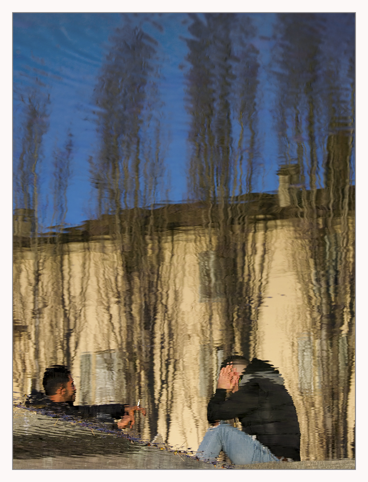 Emblematico questo riflesso, solitudine declinata con una sigaretta o con i propri pensieri. Ma c'è anche il sole ed il cielo azzurro.
