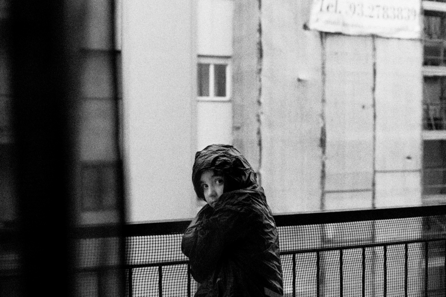Per me una buona scelta quella di lasciare ampiezza attorno al soggetto, così da renderlo piccolo dentro quell'anonimo contesto urbano.