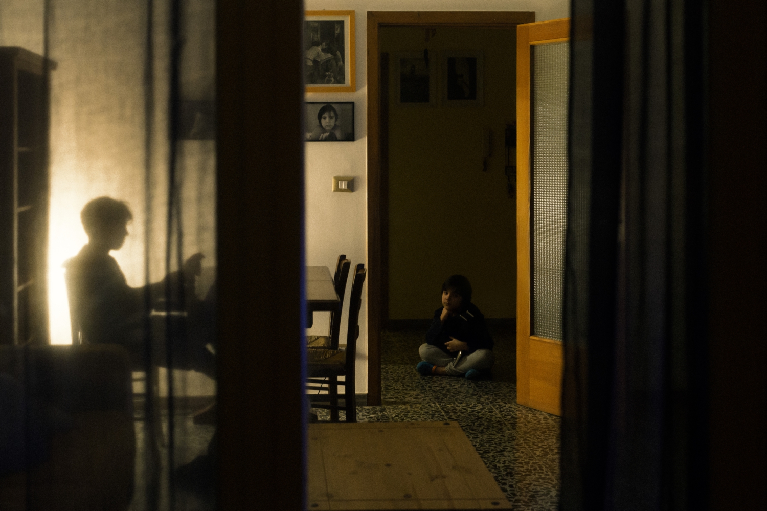 Un momento di tempo sospeso in questa sospensione delle nostre vite. Un tempo domestico con spazio anche per momenti introspettivi in cui qui sembrano presi i due ragazzi, separati in due spazi fisici (e anche interiori, forse), separati visivamente anche al nostro sguardo dall'elemento scuro in primo piano.