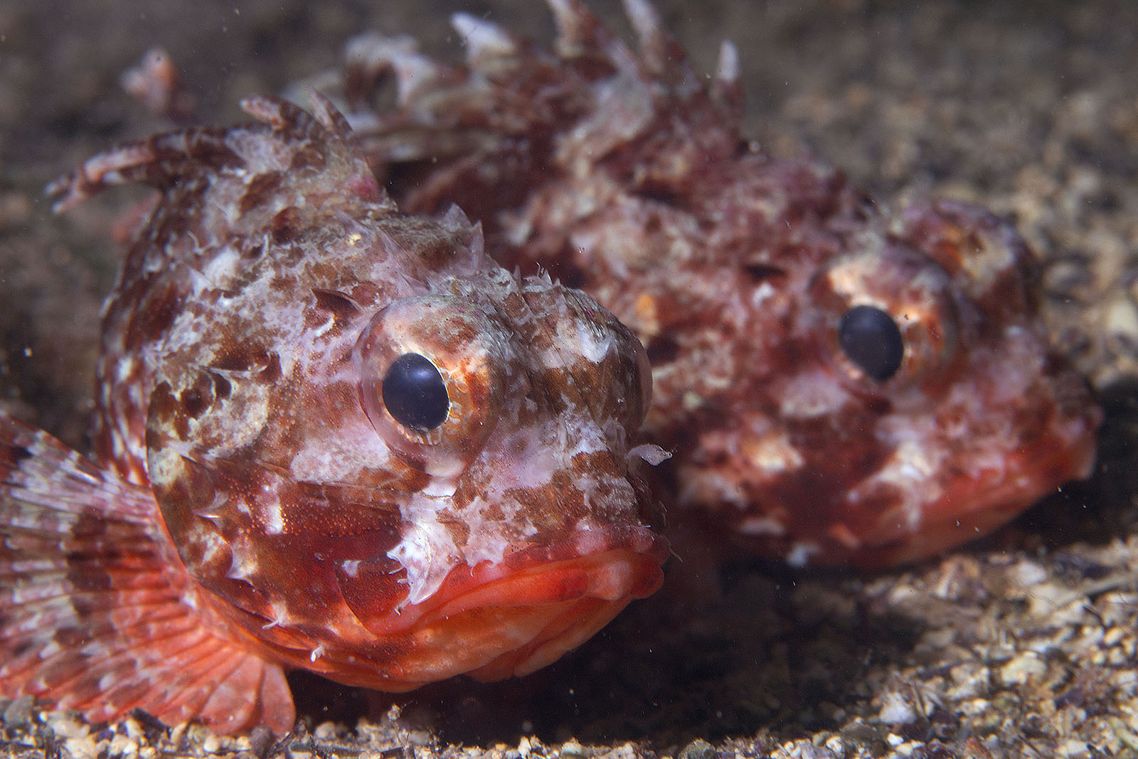 Una coppia di scorfani adagiati sul fondale sabbioso di notte, probabilmente in attesa di prede.