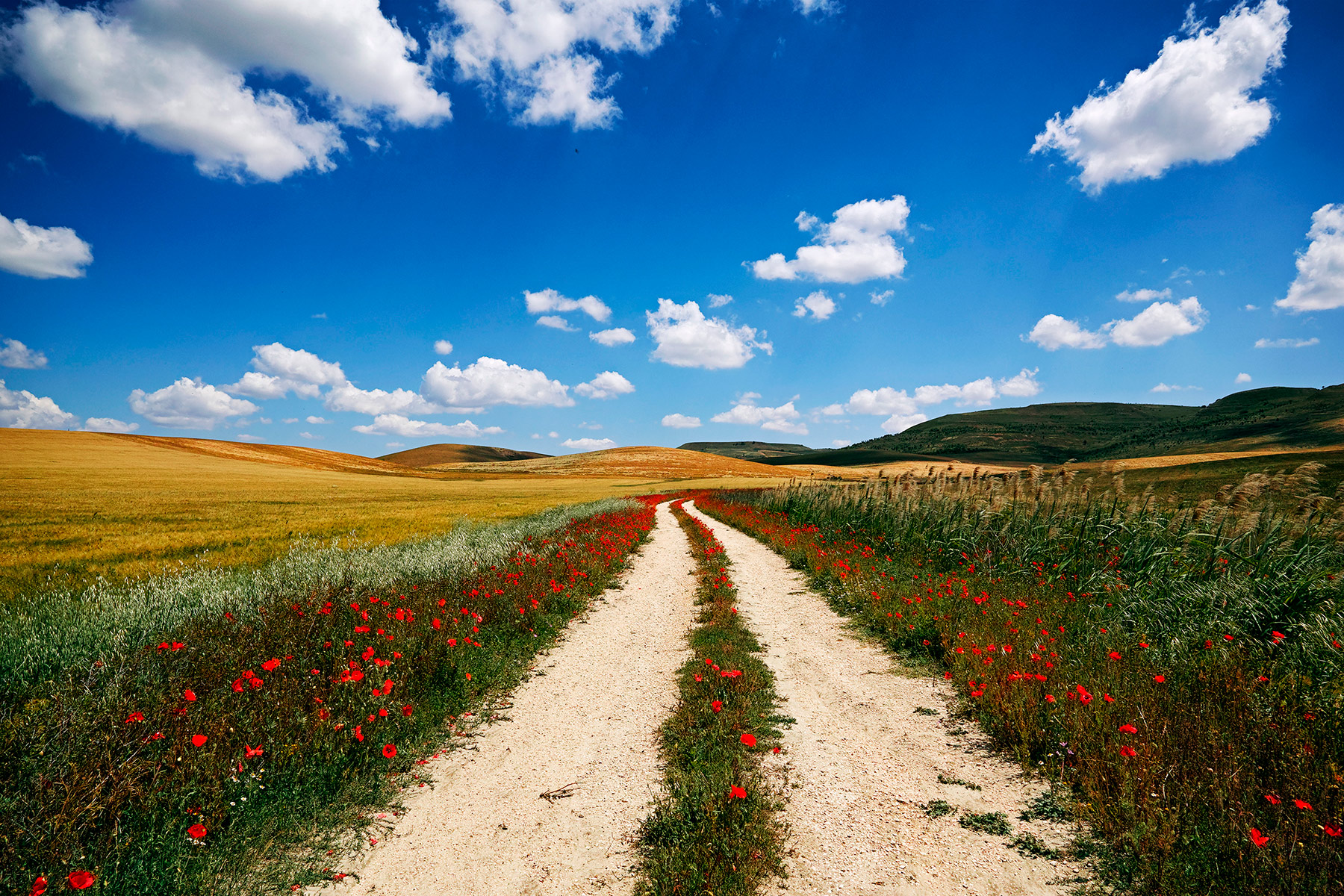 un'immagine simbolo dell'estate: cieli azzurri, campi di grano e la stradina polverosa con gli immancabili papaveri che guida lo sguardo. Molto bella