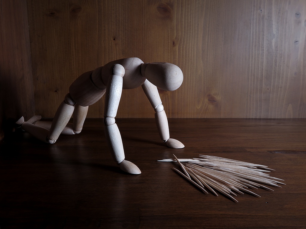 Molto stimolante l' idea di inserire le stringhe di legno sul pavimento, osservate dal simil burattino accovacciato sopra di esse.