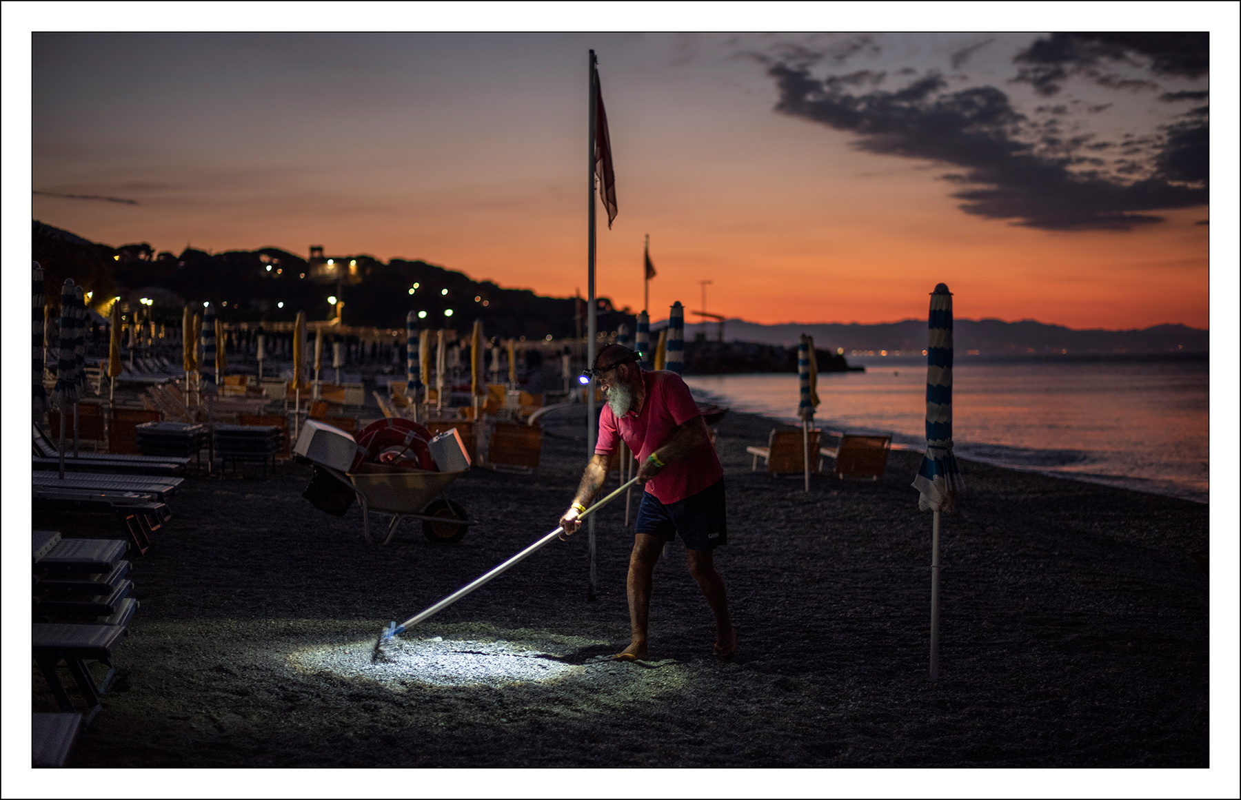 sta rastrellando la spiaggia come ogni mattina questo lavoro richiede, specie per la riva del mare.