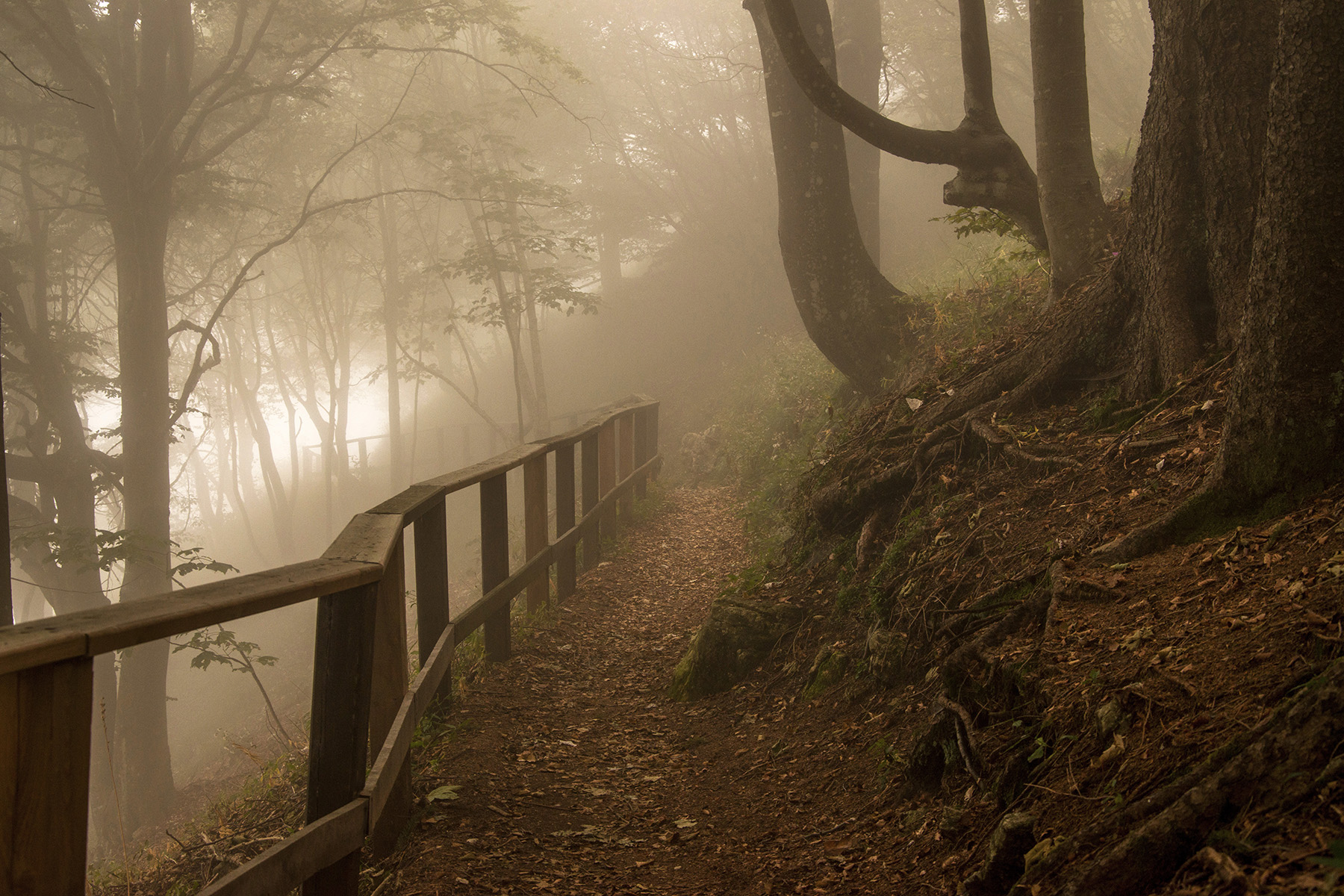 A parte l'atmosfera misteriosa e avvolgente che spesso si ritrova nei tuoi scatti, di questa fotografia mi piace molto la prospettiva che offre il sentiero e il contrasto tra i due bordi lignei del cammino: le radici, così disordinate e vive, le assi, così ordinate e morte.
