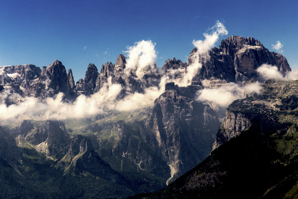 Gli exif tradiscono la natura digitale dell'immagine, eppure a prima vista sembra una foto analogica scattata negli anni 70 per la resa ottenuta. Fa venire in mente una gita, un'escursione con una di quelle belle macchine fotografiche di famiglia appesa al collo con la pellicola caricata e ancora tante pose da esporre. L'impatto con questa ampia veduta è mistico. Ci si sente quasi mozzare il fiato. Le nuvole si infrangono tra le vette come onde sugli scogli. A tratti c'è un drammatico contrasto che non vuole sedurre con dolci toni e candide sfumature ma vuole colpire con la forza emotiva che uno scenario del genere sa suscitare. Mi piace Ciao