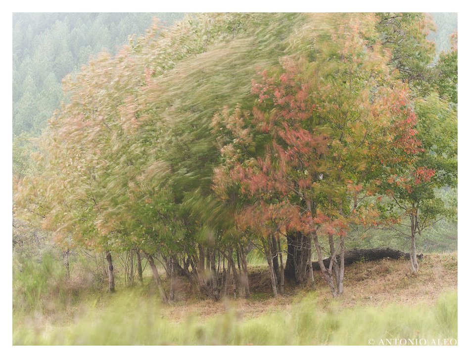 Anch'io ho provato diverse volte questo genere di scatti sfruttando il vento impetuoso dove si dovrebbe avere il tronco fermo e le strisciate delle foglie. Non sono mai riuscito a realizzare una buona immagine. Questa non sarebbe male, peccato che sia un po' tronca in alto. Bisognerebbe puntare su piante isolate.