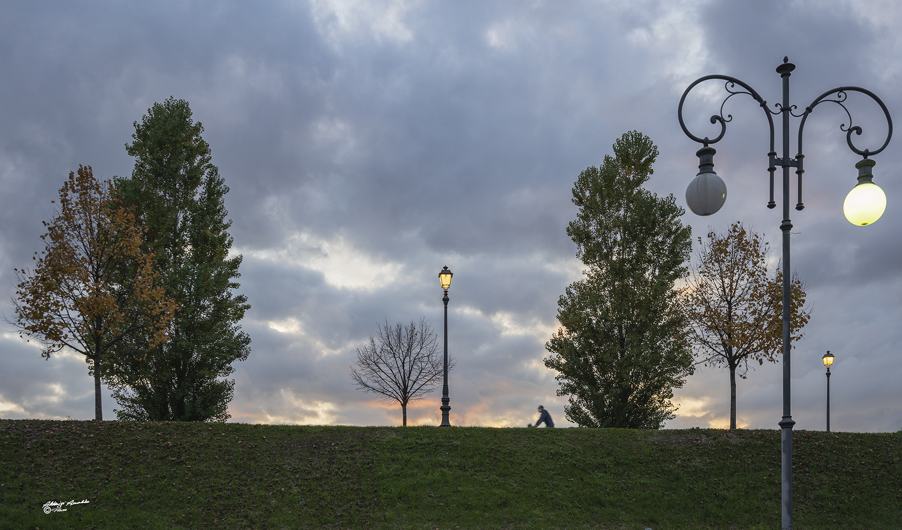 Lampioni ed alberi,luce naturale ed artificiale,una piccola figura in movimento:tanti elementi tutti ottimamente inseriti nel frame,bellissimi e naturali cromatismi.Mi piace molto e la tengo tra le preferite. Buona giornata,Sergio.