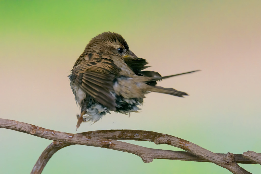 Sembra stia facendo una giravolta, è stranissima la posa, incuriosisce e strappa un sorriso. Mi piace tantissimo la tonalità dello sfondo,bello l'intreccio del posatoio e efficace la maf! Una bella proposta Ciao