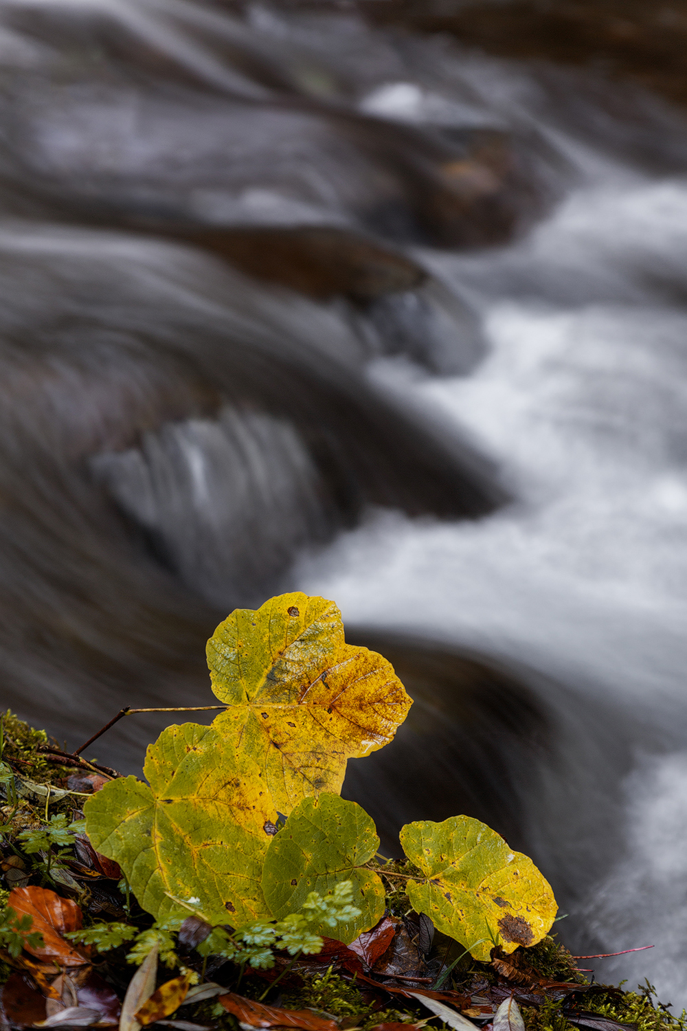 Scatto molto originale… mi piace che tu abbia dato risalto alle foglioline in primo piano piuttosto che al torrente impetuoso sullo sfondo, come sarebbe stato più ovvio… E poi è molto bello il contrasto tra il giallo-verde delle foglie e il grigio sfumato dell’acqua… complimenti!
