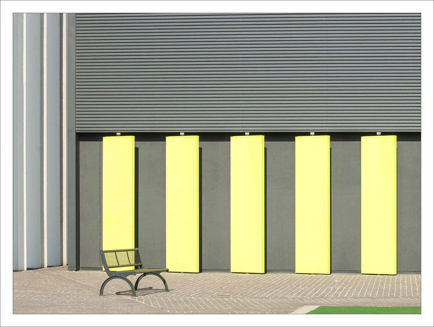 Una panchina rigorosa così come rigorosa è l'ambientazione, nulla a che vedere con la melanconia che ispirano le panchine vuote di giardini e simili. E quello spicchio verde di similerba accresce la sensazione di un non luogo dove la sosta in panchina è utile non certo per rilassare l'animo ma per poggiare qualche pacchetto di acquisti o allacciarsi una scarpa