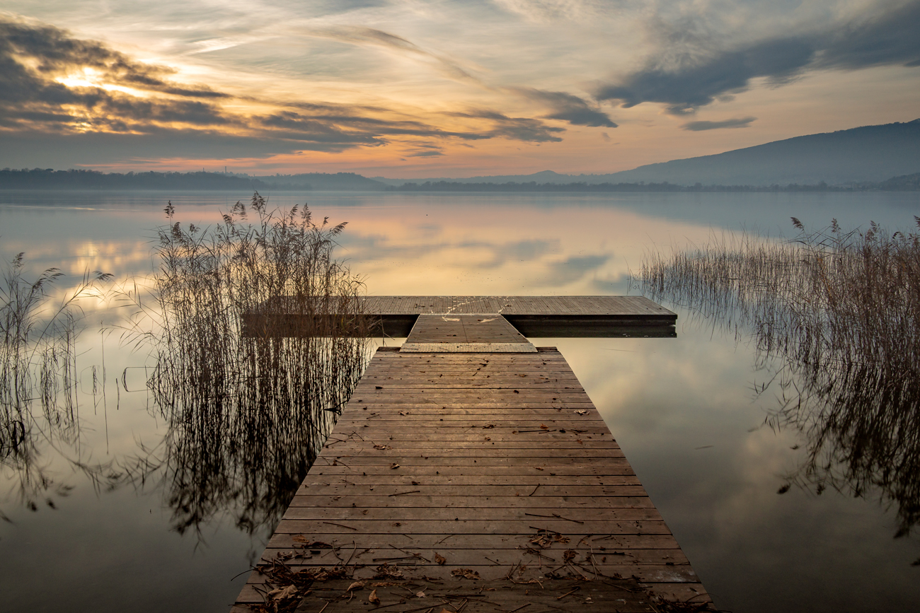 tutto immobile, l'acqua come uno specchio riflette la bella luce. I toni sono delicati e si respira la rilassante atmosfera lacustre.