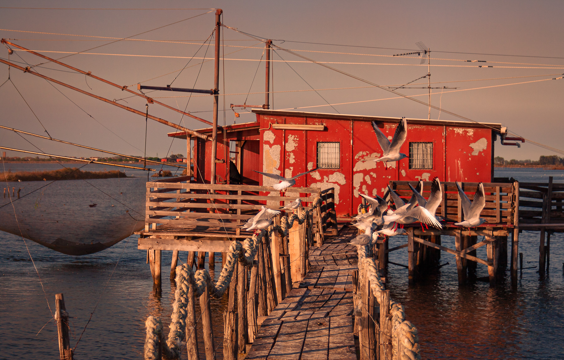 Luce, colori e atmosfera sono bellissimi, ma la trovo anch’io un po’ stretta e soprattutto trovo che il volo degli uccelli si confonda sulla casetta, forse avresti dovuto essere più lontano e aspettare che si alzassero di più…