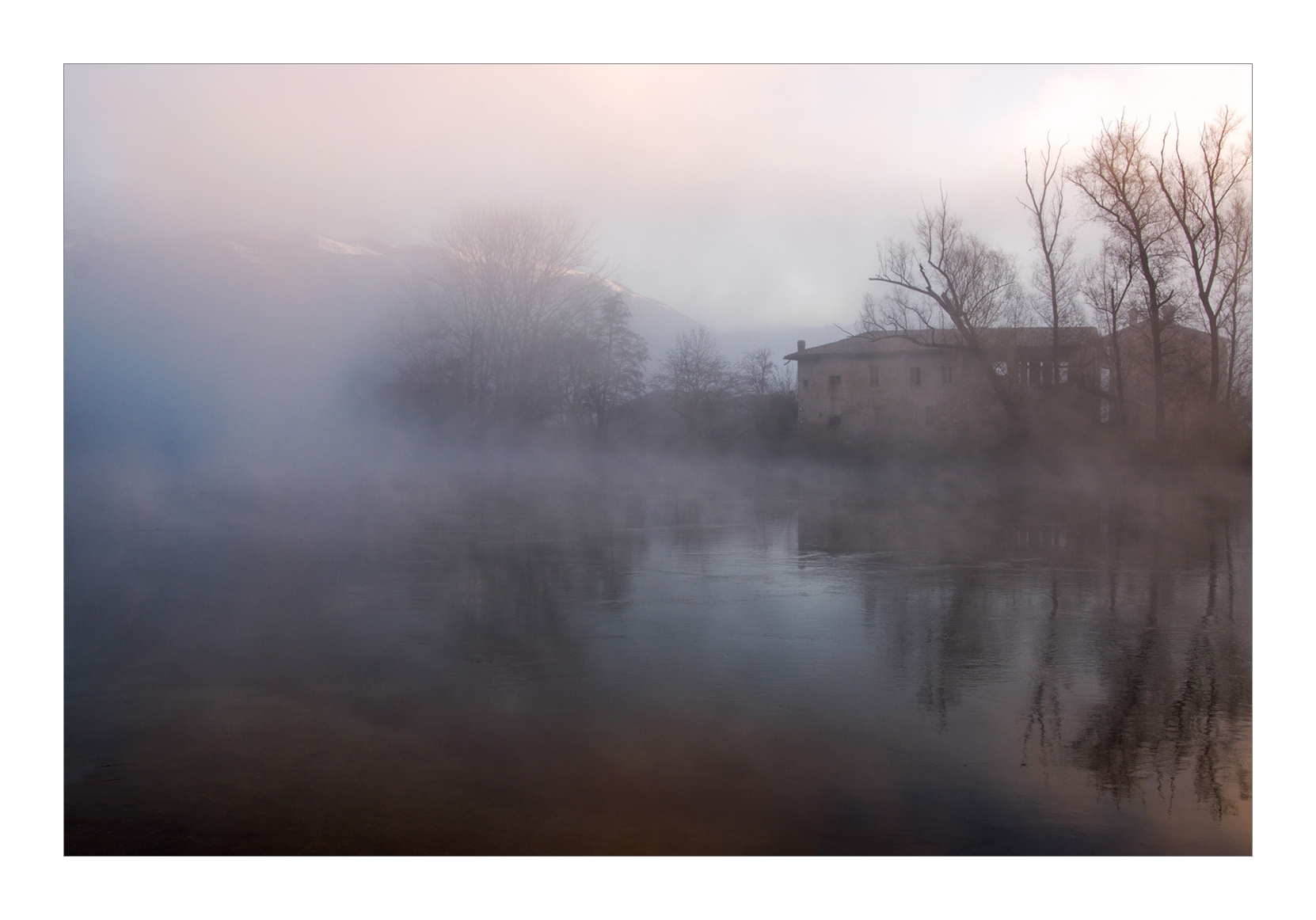 Ma che bella, acqua, nebbia e casolare, tre elementi inseriti nel fotogramma ottimamente e i delicati colori suggellano l'ottimo risultato ... bravissima
