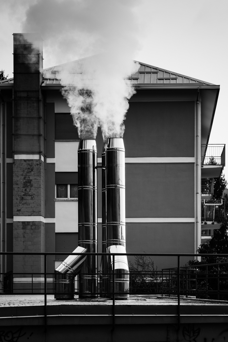P.S. anche se l’effetto è ben altro, i due tubi sono parte del sistema di riscaldamento. Il fumo non è altro che vapore.