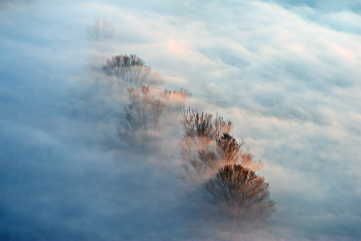 Bellissimi i bagliori della luce calda che illuminano i rami delle piante ed che emergono dal mare freddo della foschia. Complimenti  _________________ Massimo Facco