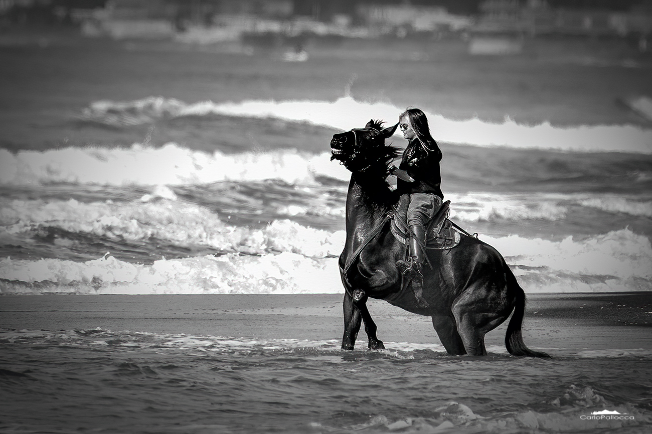 | Gran bel momento colto: il nervosismo del cavallo e quello del mare con le onde. Bella la conversione in BN. |