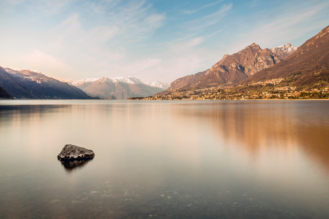 Un bellissimo paesaggio rasserenante in toni chiari e caldi che si affacciano su un lago calmo e piatto che risplende di riflessi.