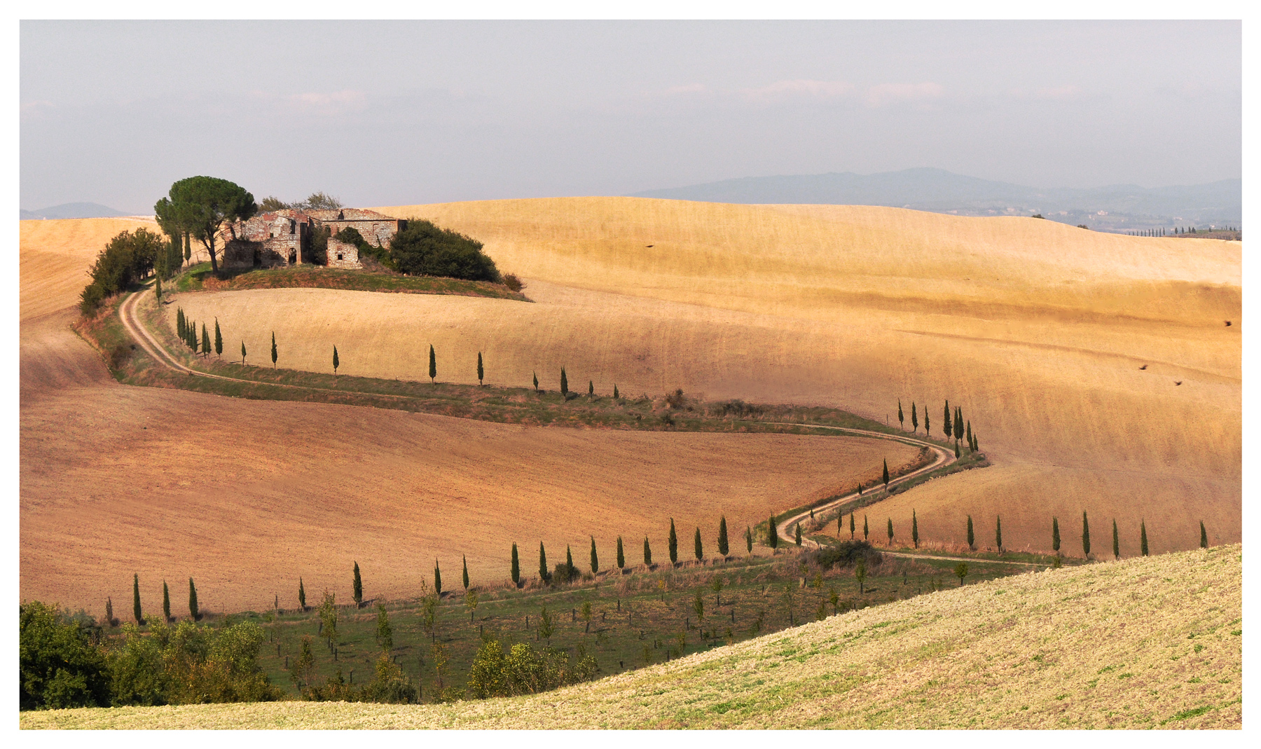 Una composizione molto bella, specialmente quella stradina tortuosa che ci conduce al casolare, anche i colori fan bene la sua parte. mi piace.