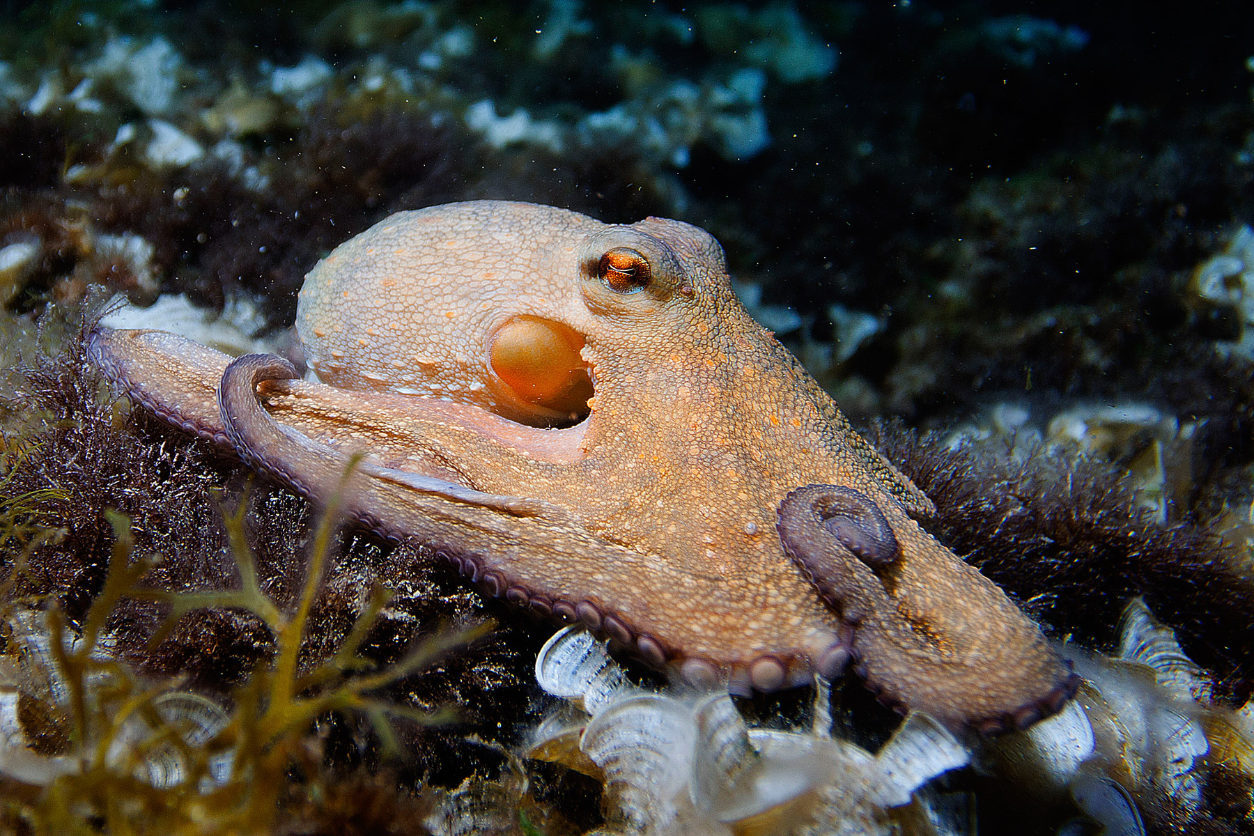 Un polpo sorpreso a vagare sul fondale di notte;