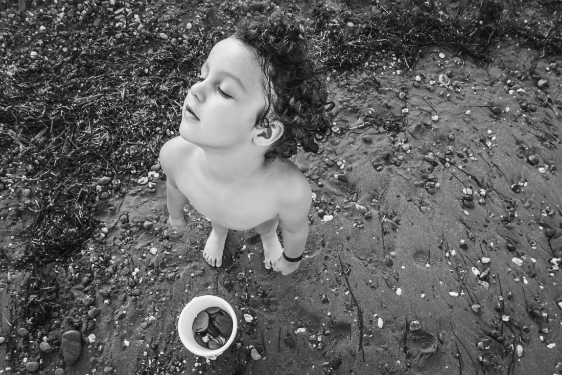 Un ritratto delizioso e atipico, sia per il punto di scatto che per la focale. Mi piace molto come i riccioli si confondano leggermente con le alghe a terra.