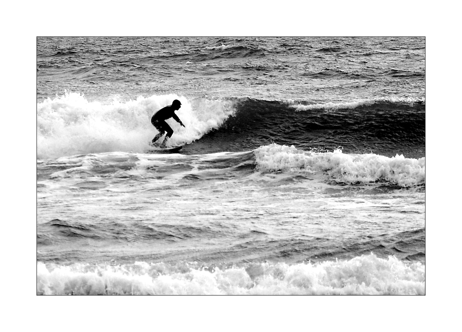 Buono il momento di scatto con il surfista ben visibile; bel b/n.