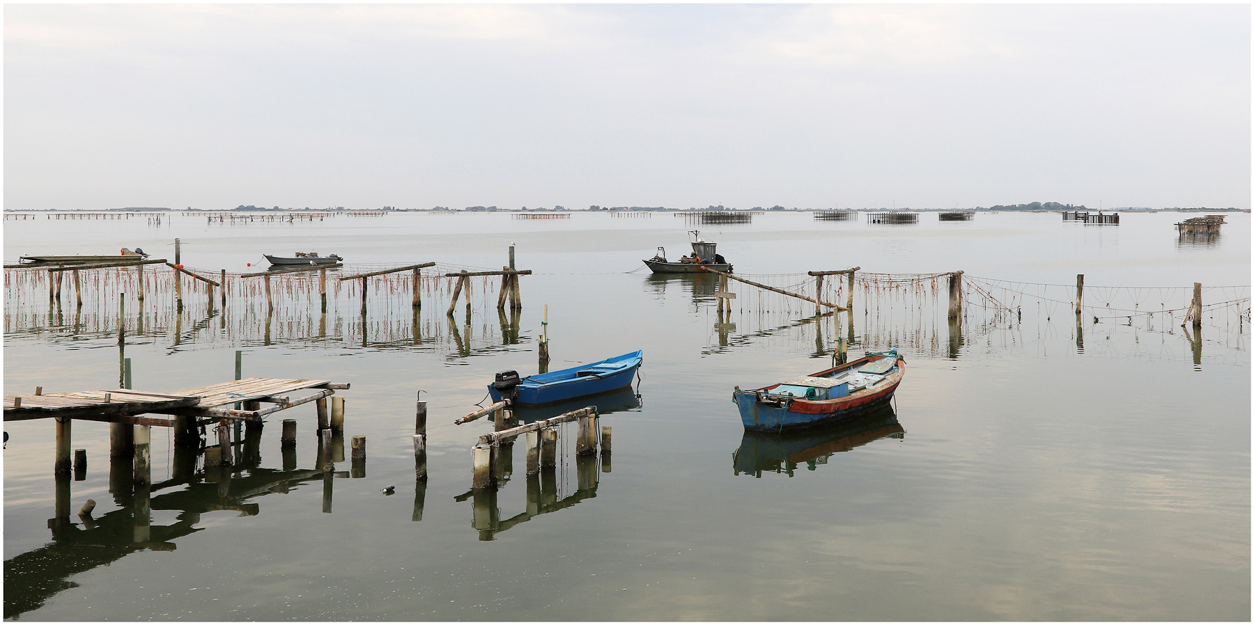 Che delizia questo paesaggio delicatissimo quasi in un'unica tonalità di colore tenuo tra cielo e mare. Pali, reti, moli, e barche segnano come graffiti questa uniformità a malapena palpabile.