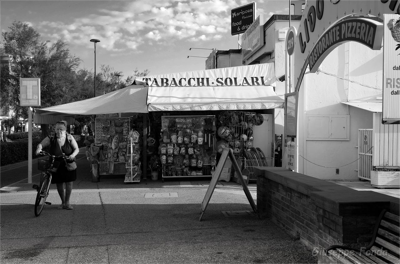 Per me e' una foto ben congeniata,composizione equilibrata con il "tabacchi - solari" che spara un colpo di luce (solare) sulla signora in bicicletta . Forse e' un filo arzigogolata ma io la interpreto cosi'.