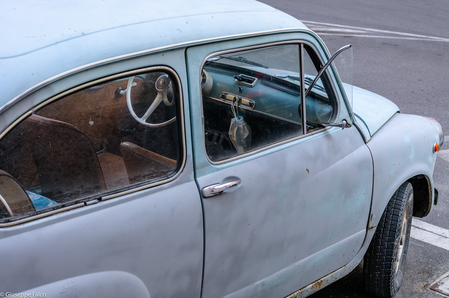 Potrebbe essere un’immagine vintage, ma la mascherina la riporta ai giorni nostri… Carrozzeria malandata ma pneumatici discreti per un veicolo utilizzato e ancora fascinoso… Inconsueto il taglio che la rende originale e dinamica