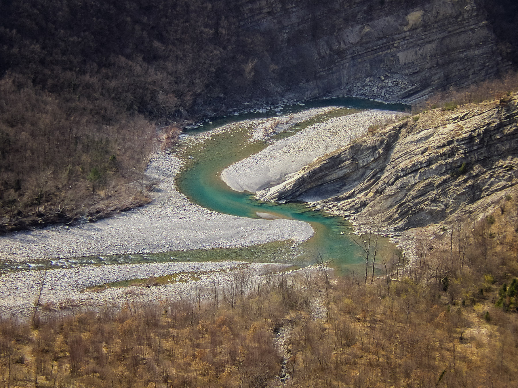 Bella questa curva fluida dalle tinte smeraldine che si insinua nel paesaggio roccioso.