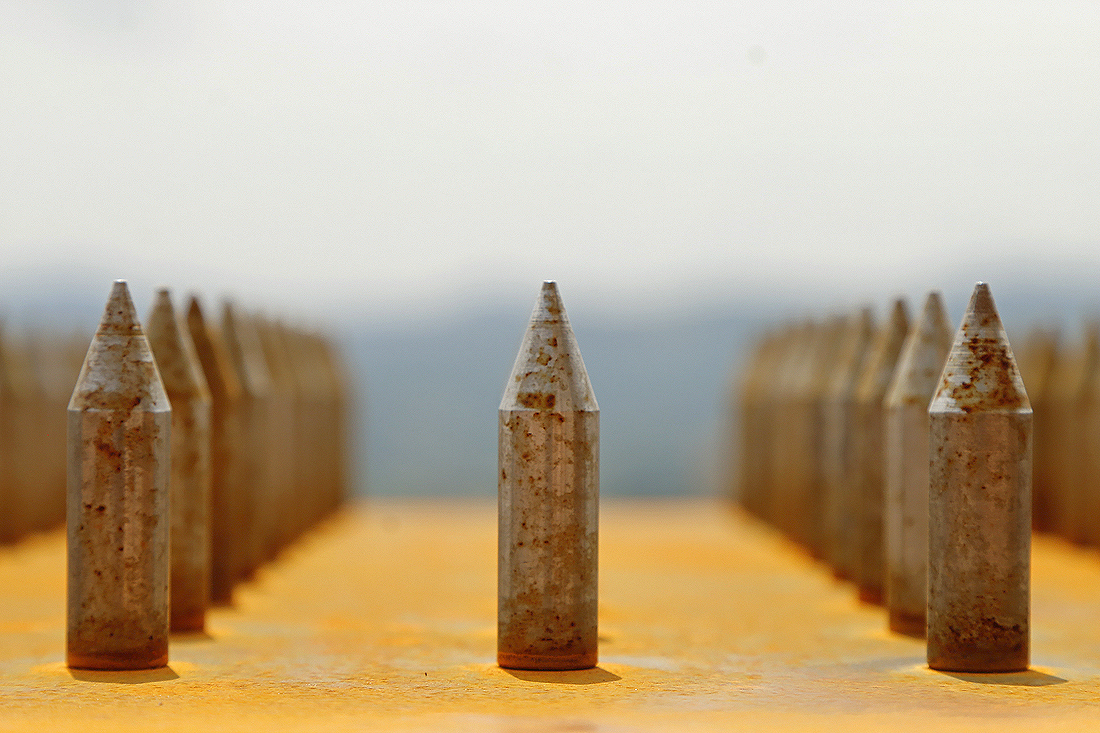 Non è uno scatto preparato e pensato a priori. In realtà è veramente del tutto estemporaneo ed all'aperto. Mi trovavo a Gubbio quando ho scattato. Sono rimasto attratto dalla superficie spessa di un muro di cinta della bella Piazza che si affaccia come un terrazzo in quel punto. Sopra il muro vi erano conficcate tutta una serie di punte metalliche piuttosto nuove (ma non del tutto perchè già cominciavano un po' ad arrugginirsi) credo con l'intento di evitare che i piccioni possano sostare sul muretto e sporcarlo. Una protezione che mai avevo visto così consistente e anche di bella fattura. Lì per lì ho studiato come potevo al meglio l'inquadratura per dare un senso di allineamento e simmetria pensando ai tanti soldati di un battaglione in parata.