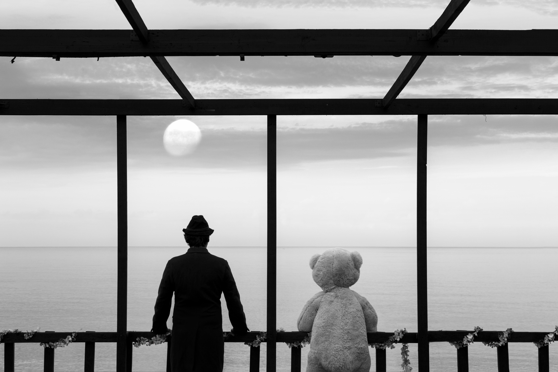 libera interpretazione, non so cosa volesse dire l'autore con questo scatto ma un umano e un pupazzo che guardano l'infinito in monocromia, cas'è la realtà che cosa c'è di vero , è tutta una finzione? chi dei due vede davvero il mondo reale? credo solo uno...