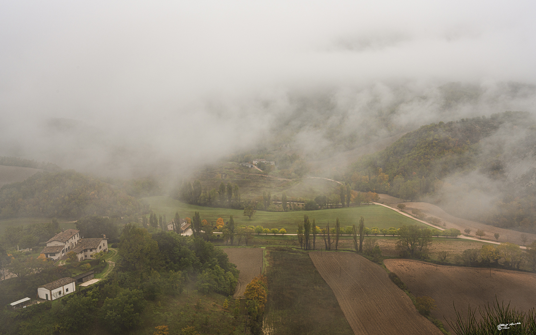 A me piace molto le case fanno un pò da cornice a questa vallata con i campi lavorati e ben tenuti, raccolti in questa leggera foschia.( sicuramente se la nebbia non c'era non era la stessa cosa.)