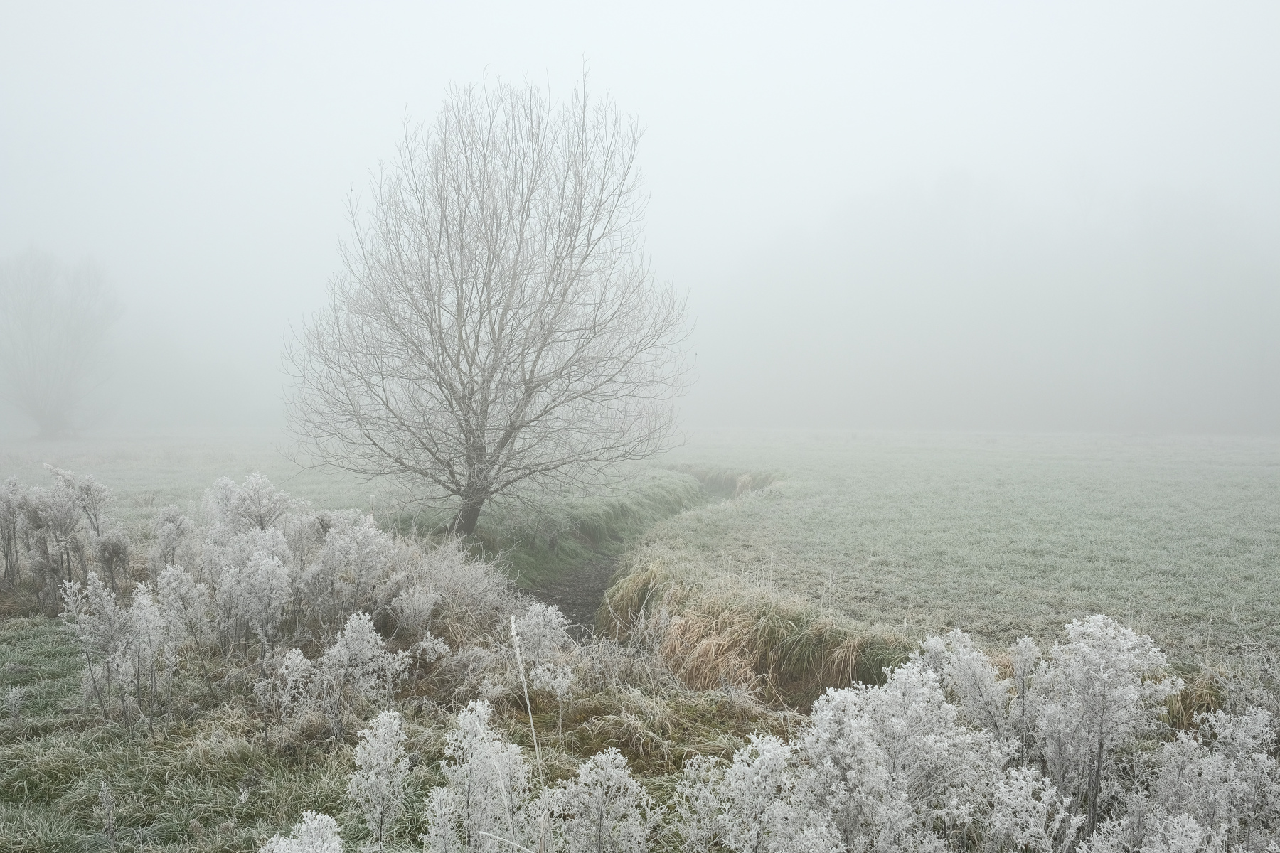 Anche L'albero solitario cresciuto sul margine di un fossato aggiunge emozionale sensazione all'immagine che si fa silenzio e quasi glaciale meditazione.